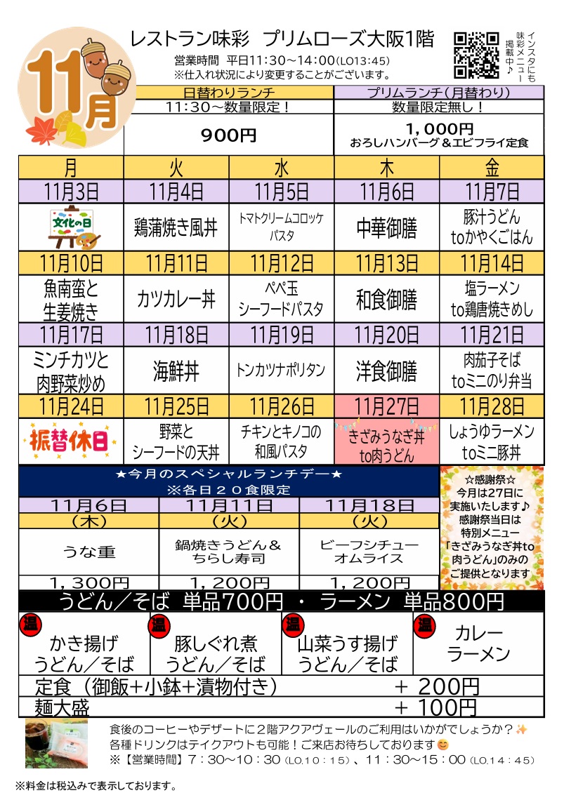 レストラン味彩ランチメニュー【11月】
