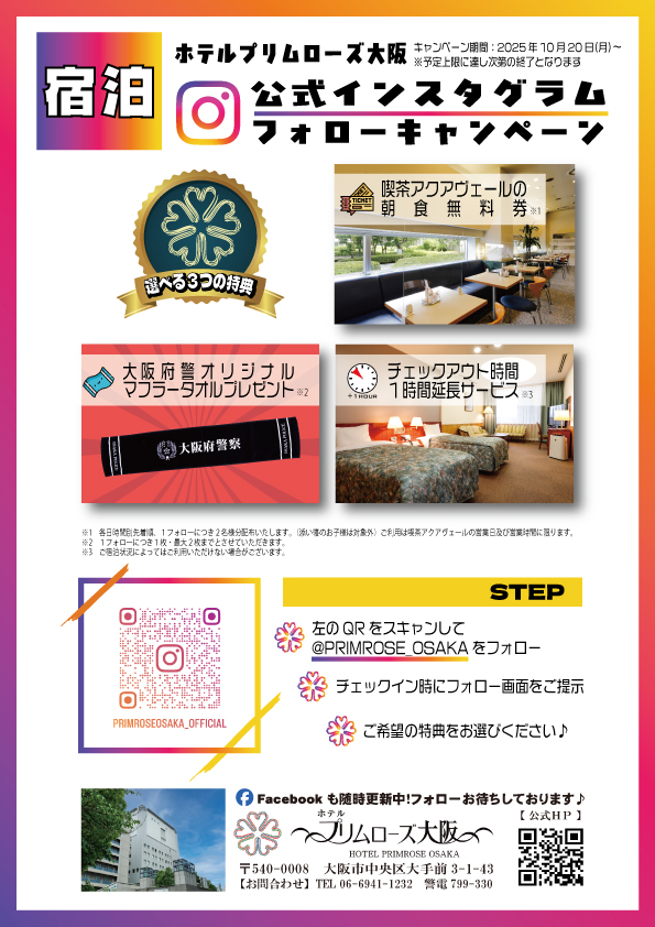 ホテルプリムローズ大阪の公式インスタグラムをフォローしていただくだけで、